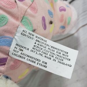 This vintage Interpur stuffed bunny rabbit is a charming addition to any collection. With its soft pink and white fur and adorable jellybean outfit, this plush toy is perfect for children ages 3 and up or collectors of all ages. Made in Thailand in the 1980s, this 12 inch bunny is sure to bring a smile to anyone's face.