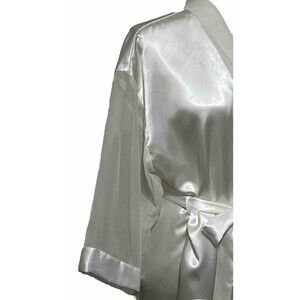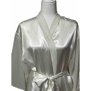 Add a touch of elegance to your sleepwear collection with this Vintage Intimo Amore kimono-style robe. Made in the USA, this medium-sized robe features a silky satin material and sheer 3/4 sleeves. Tie closure inside and outer belt.