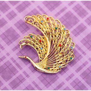 Vintage Intricate Stylish Gold Tone Peacock Majestic Rhinestones Brooch