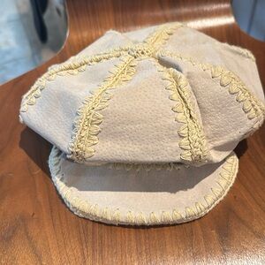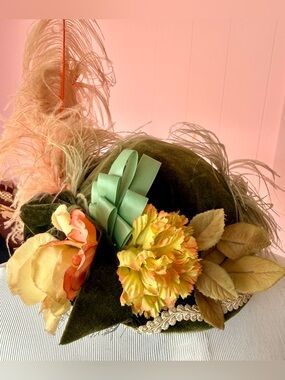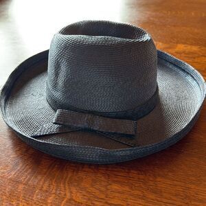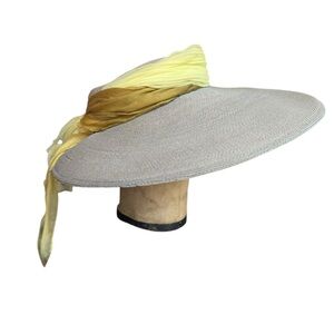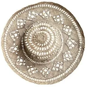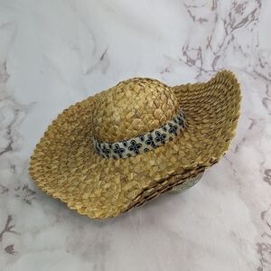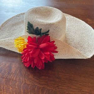 Vintage handcrafted straw hat with intricate design work. It has some bounce to it, but edges stay up and do not flop downward.