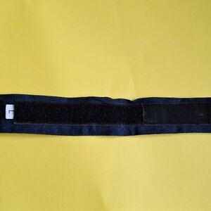 Adjustable dark blue denim band with back loop closure, 39" long.