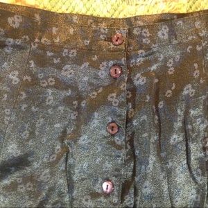 This lovely little 90's number is by ExactChange. It is made of this magical iridescent floral fabric that seems to change colors with the light. In person, it is more dark silver than the pictures suggest. The flowers are two-toned blue, though. It's an A-line, high-waisted style with purple buttons down the entire front. States is a Size 7 but I think it would fit a Small or XS. Laying flat: waist 13", length 18". {054}