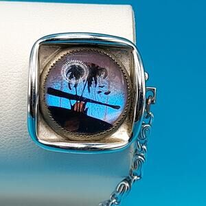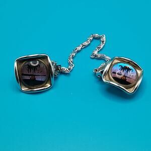 Vintage Iridescent Palm Scene Sweater Clips, 1950s Butterfly Wing Jewelry