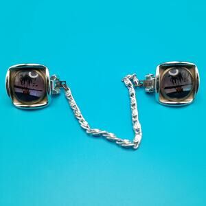 *Description: This is a great pair of vintage sweater clips in a silver tone background with a 4 inch light weight chain from around the 1950s. The sweater clips look like earrings but have little prongs on the back of the clips to hold the sweater in place. The background was advertised as butterfly wings. It is very iridescent and changes colors as you move the clips. This would be a great addition to your jewelry collection or make a great gift!