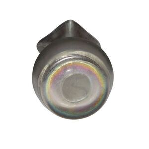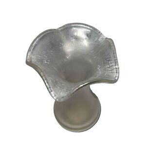 This vintage vase features a ruffled rim and iridescent pearl coloring that creates a stunning iridescent effect. The vase is unmarked, but is believed to be handmade using stretch glass production techniques. The vase measures 7 3/4" tall and is perfect as a decorative piece or for displaying flowers.