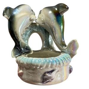 Vintage Iridescent Lustreware Ceramic Blue Dolphins on Trinket Bowl 1960s