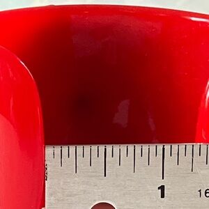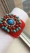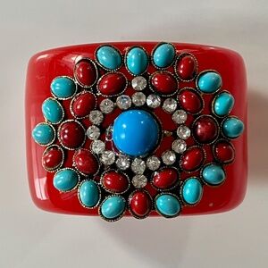 Own a piece of an icon’s treasures! A bright and eye-catching retro cuff with mounted turquoise and red enamel beads and rhinestones. The cuff has an interior diameter of 2 3/8" and an opening of 1 1/4". Excellent condition as shown in the photos. One very small light mark on the front; see detail picture.