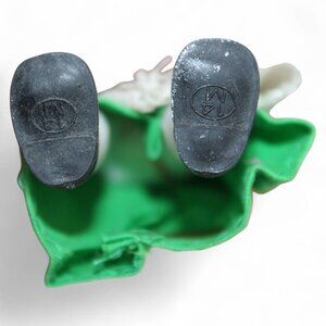 A charming piece of nostalgia, this vintage Irish doll wears a traditional green dress and apron. Her blonde braids, tied with red ribbons, and delicate sleeping eyes evoke a sense of heritage, making her a cherished collectible or keepsake.