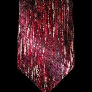 This tie is vintage in excellent condition. Features burgundy, red, pink, and cream design that looks like hand-painted graffiti style. Measures 4” traditional width and 58” traditional length. 100% silk.