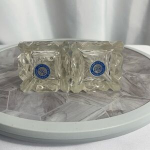 Add a touch of timeless elegance to your table setting with this beautiful pair of vintage salt and pepper shakers imported by Irving W. Rice & Co., Inc. Made in West Germany, these crystal shakers feature a stunning geometric pressed glass pattern with silver-tone metal screw-on tops. A true mid-century collectible, both pieces still have their original “Irice” import stickers intact.