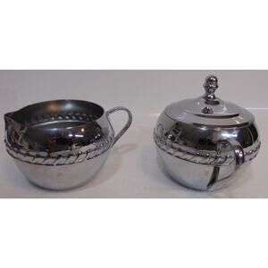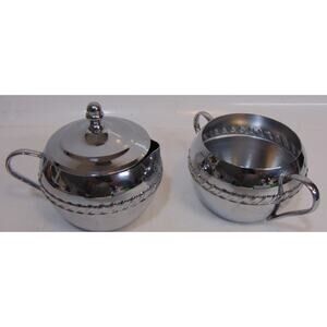 Vintage Irvinware Stainless Metal Silver Sugar & Cream Bowls Handles Lid Set Collectible Replacement Decorative Decoration Irvin Ware Tableware Server tea Coffee Fancy Ornate Made In The USA