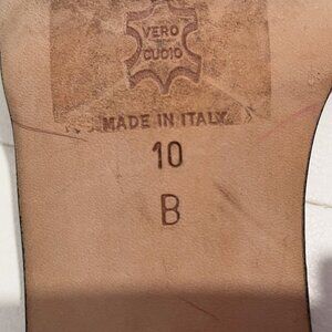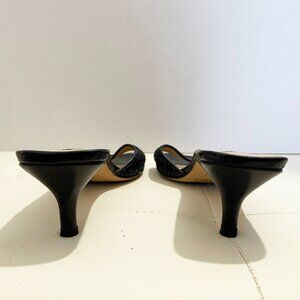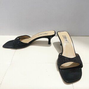 Elegant open-toe black sandals/mules with a sleek design and glittery front. Approximately 2 1/2 inch heel - just enough to be sophisticated while still being comfortable. Size 10B. Perfect to elevate any outfit. In good pre-owned condition with normal wear to the bottom of the heels and foot bed. See images. A nice vintage find.