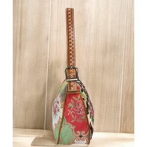 This vintage Isabella Fiore Leila-Marissa Hobo Bag from the early 2000's is just gorgeous! Featuring a floral brocade fabric with beaded front details and a cross- stitched leather handle, this bag is giving off all the Y2K vibes. If you love the style and quality of vintage, Y2K Isabella Fiore bags you need this in your collection!