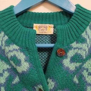 Lovely vintage women’s cardigan with a two-toned blue floral allover pattern on a teal background. From FB Isabella. Relaxed fit with drop sleeves and shimmery mother of pearl button closure. Ribbed cuffs, neckline and hem. Made in Italy.