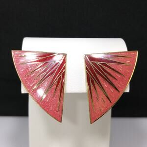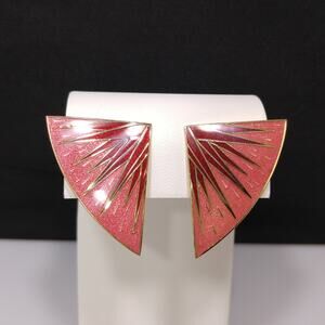 *Description: This is a beautiful Isle of Skye red and rose enamel clip on pair of earrings with gold plated cloisonné and backing from the 1980s. Each of the individual sections are outlined in gold. The rose enamel has a metallic pattern within the background and the dark red also has a metallic sheen when observed under magnification. This would be a great addition to your vintage jewelry collection or make a great vintage gift!