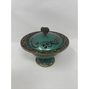 Vintage Israeli Turquoise & Brass Decorative Bowl w/ Lid Heart Handle