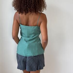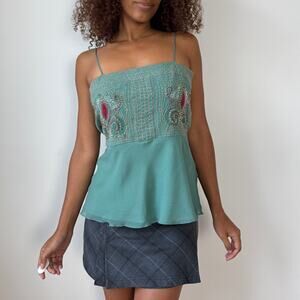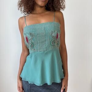 Seafoam-teal 100% silk camisole with intricate bead-and-thread embroidery across the bust, slim spaghetti straps and a softly flared, bias-like drape; clean side zipper closure. Hand sourced in Italy. Lingerie-inspired.