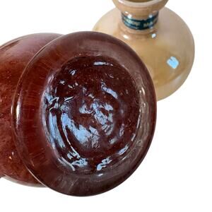 One bottle is a warm caramel beige tone, while the other displays a deep chestnut brown hue—both beautifully unique with natural color variations and bubbles typical of handblown Murano-style glass.