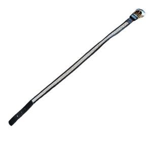 Gorgeous leather belt is black with clear rhinestones and a silver hammered buckle. Features 3 sizing holes.