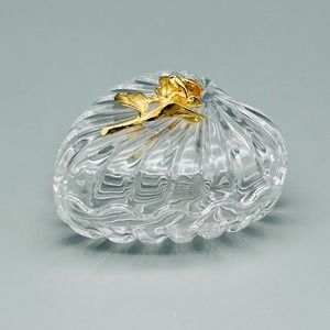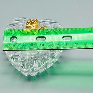 Vintage Italian “Courtenay” Heart Shaped Gold Rose Accented Crystal Trinket Box. This pretty gold rose accented crystal trinket heart shaped box is in good preowned condition with no chips or cracks, original sticker is still attached. Perfect for a jewelry gift and bedside jewelry holder. This piece measures approximately 2 3/4” wide by 2 1/4” tall.