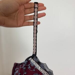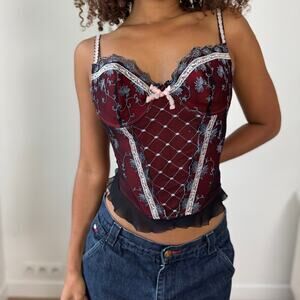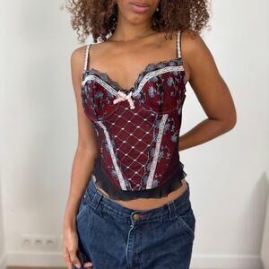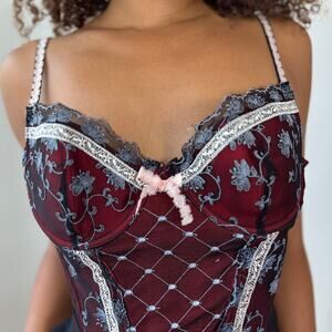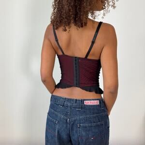 Burgundy mesh corset with delicate black lace trim, pink ribbon details, and underwired cups; Hook & eye back closure and adjustable shoulder straps. Fitted lingerie-inspired silhouette. Made in Italy. Perfect for Halloween styling.