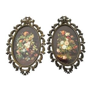 Vintage Italian Floral Art Set 2 Ornate Brass Picture Frames Italy Baroque Style