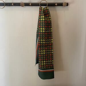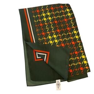 Add a bold pop of vintage style to your wardrobe with this 1970s Italian polyester scarf featuring a rich dark green background with a striking mod geometric pattern in yellow, orange, and red.
