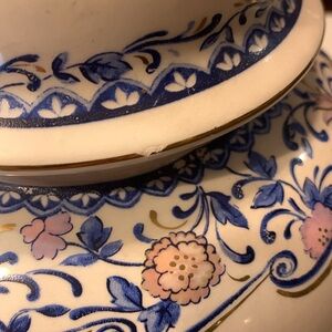 White and assorted blue patterns with floral sprigs in muted colors with exotic birds