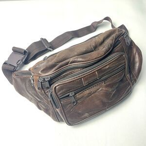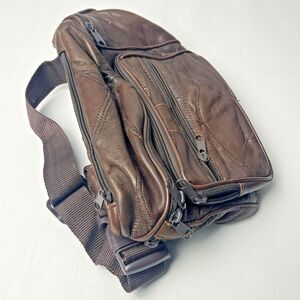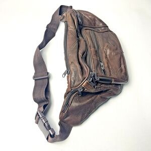 Vintage Italian Leather Oversized Fanny Pack Bag 6 Pockets Adjustable Brown