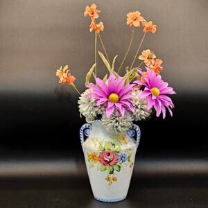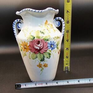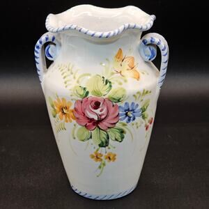 Vintage Italian Majolica Earthenware Vase - Hand Painted & Numbered. Artist could be Bruno Brolli???. Measurements in pictures. There is a mark on the pottery under the handle that is from the glazing process and a slight flea chip on the rim. This Italian Majolica earthenware vase features a hand-painted design with double handles, showcasing exquisite craftsmanship. Signed and numbered, this piece is a stunning addition to any collection or as a decorative centerpiece for rustic or vintage-inspired home decor.