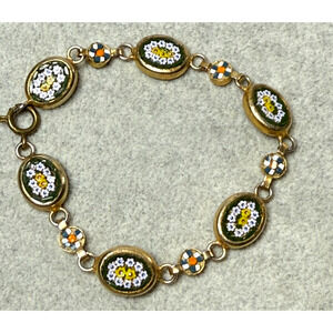 Vintage Italian Micro Mosaic 8" Oval Link Bracelet Gold Tone Green Blue Floral