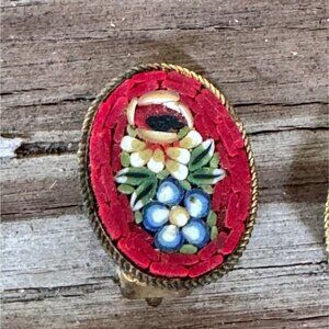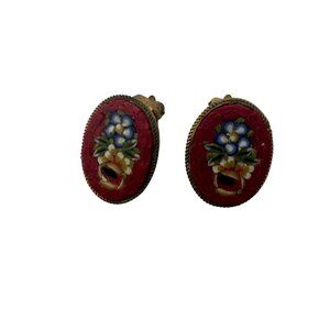 These vintage clip-on earrings are a delicate display of Italian craftsmanship. Featuring intricate micro mosaic floral designs set on a vibrant red backdrop, complemented by a gold-tone backing. A timeless accessory that combines artisanal detail with classic elegance, perfect for thoughtful gifting or personal collections.