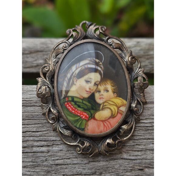 Vintage Italian Ornate 800 Silver Mother & Child Portrait Brooch / Pin /Pendant