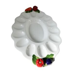 This exquisite vintage made in Italy pottery deviled egg tray beautifully combines functionality with artistic flair. Crafted from high-quality white ceramic, it features charming porcelain vegetable accents on either end, adding a delightful touch of whimsy. Each compartment is perfectly sized for deviled eggs, making it an ideal centerpiece for gatherings and celebrations. The tray's timeless design not only showcases your culinary creations but also serves as a stunning decorative piece that reflects the rich tradition of Italian craftsmanship.