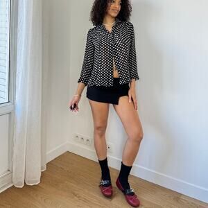Timeless vintage 90s black and white polka dot blouse, made in Italy from a semi-sheer lightweight fabric. Features a classic collared neckline, button front closure, and 3/4 sleeves — perfect for elevated casual looks, French-girl style, or layering over lingerie.
