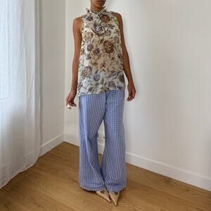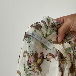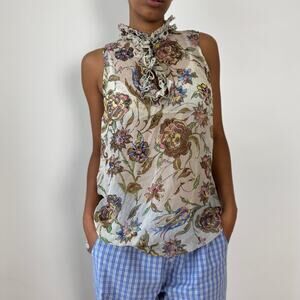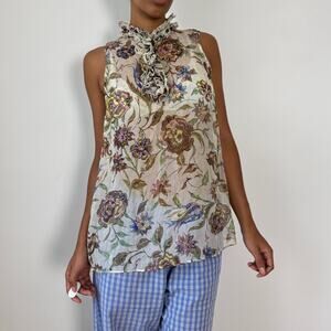 Semi-sheer mesh with a painterly floral print and a romantic ruffle neckline with front frill. Sleeveless, longline tunic cut with a soft drape. No stretch. Italian vintage.