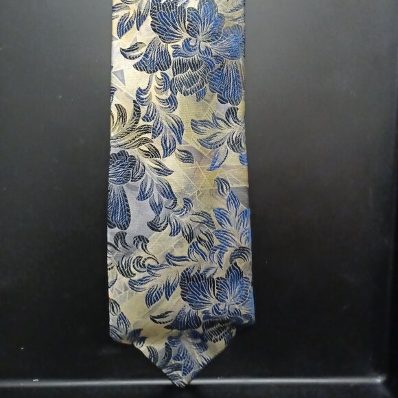 Vintage Italian Silk Tie - Barcelino; vintage silvered silk with Chinese inspired royal blue floral brocade motif.