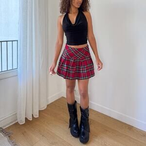 Red tartan woven mini skirt with pleated panels and a flattering bias-cut waistband; classic A-line swing and structured fit. Made in Italy. Checked/tartan minis are a key current trend—perfect for preppy or punk styling.