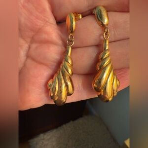 Gorgeous vintage earrings crafted in Italy, made of genuine 925 sterling silver with a luxurious layer of gold – also known as vermeil. These pierced drop earrings feature a sculptural, twisted design reminiscent of seashells or ribbon motifs. Elegant and timeless, they’re lightweight yet bold – a perfect statement piece.