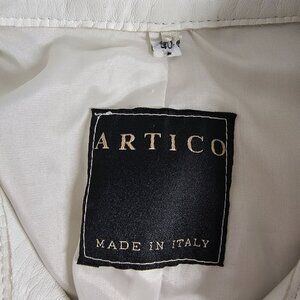 A stylish and elegant white leather jacket by Artico, featuring ruffle details and a button-up front. Ideal for adding sophistication to any outfit.
