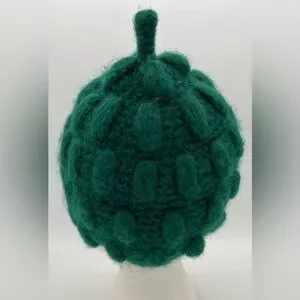 Green chunky knit beanie featuring textured knobby knit pattern and stem detail on top.