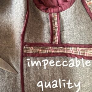 Rare luxury find!! Immaculate vintage Italian wool blend over coat. The craftsmanship and detail on this luxury coat are amazing! Prince of Wales check plaid in brown and cream base with orange, teal and fuschia contrast stripes. Ruffle detail around neckline and at wrists. Closes with one large wooden button and six jumbo contrast fabric covered snaps. Two front side pockets. Inside grey wool contrast. All inside seams are finished with contrast satin trim. A beautiful collectible piece in new condition.