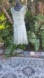 this dress is very stretchy. The body of the dress is a rayon knit I believe and the over flutter ruffles are Italian silk, which is a silk blend actually. They have a raw edge to them. The dress on brace from a pale light green to a deeper khakiin excellent condition no size tags. This will best suit a medium, but it would stretch to a large.