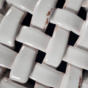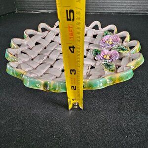 I am very pleased to present this gorgeous early 1900s Italian Majolica hand crafted open weave ceramic shallow bowl with purple flora accents. The bowl is hand painted and has a Majolica finish. The ceramic pottery basket weave base is an eggshell white with a scalloped ribbon edge in a dark green. There are two pretty purple pansies in Trompe Oeil style. This very unique and beautiful shallow bowl is more suited to display, just because it is so pretty. Place it on a table or showcase on a bookshelf hosted on an easel. The Italian design and craftsmanship are beautiful. Size 9 inches in diameter by 2 inches high. In very nice vintage condition. No damages Non smoking pet free home.