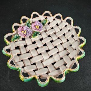Vintage Italy Majolica Handcrafted Open Weave Ceramic Shallow Bowl Purple Floral