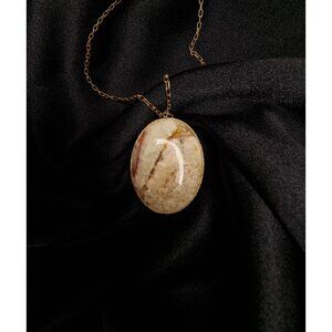 This mesmerizing oval pendant captures the raw beauty of natural stone — an exquisite fusion of earthy creams, honeyed browns, soft moss greens, and a whisper of red ochre veining across the surface. Like a miniature landscape painted by time itself, the stone bears a gentle, ancient energy. Its texture and hue resemble polished Italian marble, echoing the artistry of Renaissance sculpture and ancient Roman mosaics.
