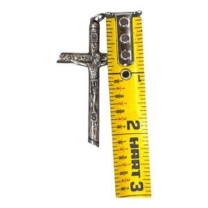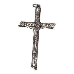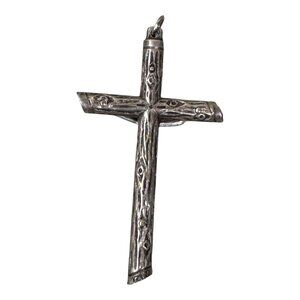Crafted with reverence, this intricately detailed silver crucifix embodies spiritual symbolism and artisan craftsmanship. The pendant's textured surface suggests a weathered, historic quality, inviting contemplation of its journey and meaning.