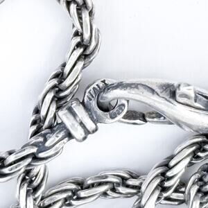 This vintage rope chain necklace offers substantial length and a bold, twisted texture. Crafted in sterling silver, it drapes beautifully and adds versatile shine to any outfit. Ideal for statement wear or layering with shorter pieces.