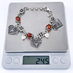 Romantic Italian charm bracelet with layered filigree hearts, floral motifs, and rich red glass beads—adjustable and full of vintage love and artisan detail.
