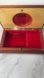Vintage Wood Jewlery Box with Wood Inlay. Inside is lined with red velvet and has a round mirror. Made in Italy. Music mechanism is made by Sankyo which plays Love Story.